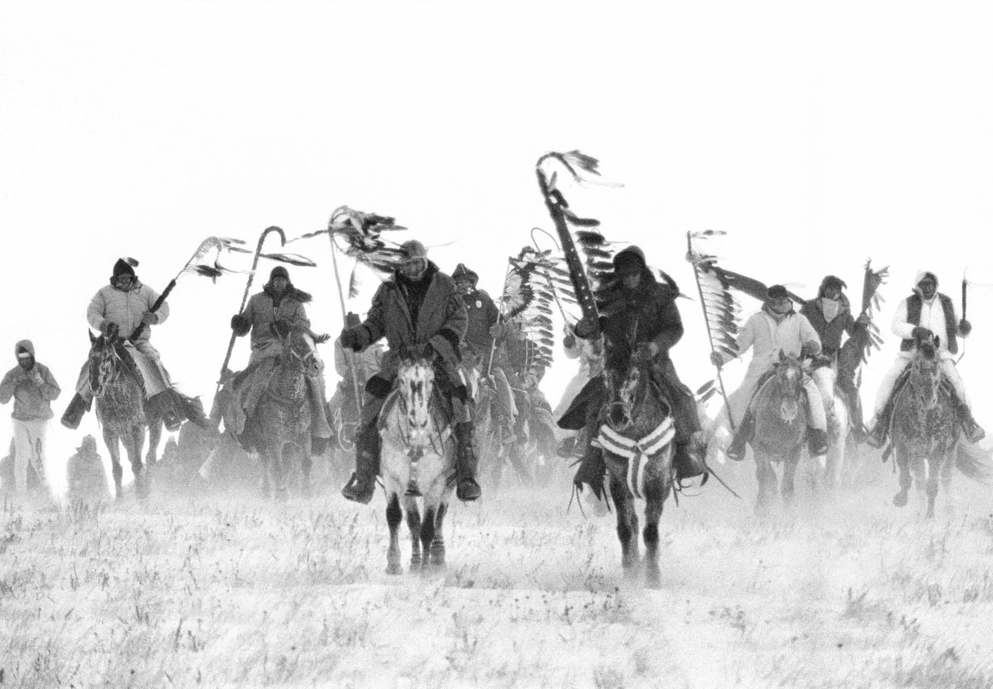 WOUNDED KNEE RIDE - Wounded Knee, South Dakota - The “Healing of Memories Ride” on December 29, 1990 commemorated the 1890 ride of Chief Big Foot’s band when they left Bismarck, North Dakota the night Sitting Bull was killed. Searching for Red Cloud who was leading his people in the Ghost Dance, Big Foot’s band encamped at what became Wounded Knee where most were massacred by the 7th Cavalry and buried there. After a four-day, sub-zero ride, Arval Looking Horse and Virgil Kills Straight lead the riders into Wounded Knee, South Dakota.